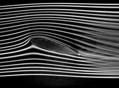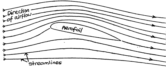 The image above shows streamlines over a wing with an aerofoil cross-section in an airflow. You can see that the lines are closer together above the wing and further apart below.
