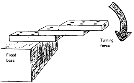 If the arrangement of the blocks was such that its centre of gravity was in front of the turning point (the edge of the fixed base), then the turning force would make the blocks turn and fall, as in the diagram below.
