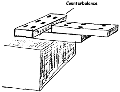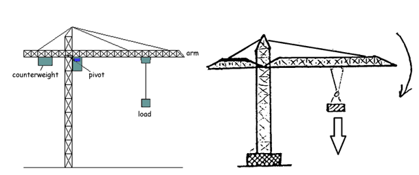 Some of the large cranes you see on building sites use counterbalance, A very heavy counterweight is fixed to the crane’s jib, at the other end from the load being lifted. If this counterweight was not present, there would be a turning force, and the crane would topple over.