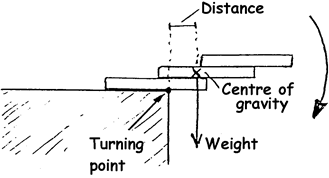 It is often said that the weight of an object acts ‘through its centre of gravity’. It is often useful to think of it this way. In the hangover problem, the centre of gravity must be behind the edge of the fixed base.