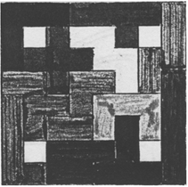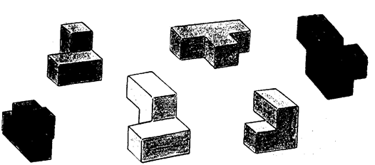 A simple three-dimensional problem. Remember the cube is three squares in each direction. Probably the easiest way of solving this puzzle was to find the surface with nearly all of its nine squares present. This was made the bottom of the cube. This gave two missing squares. The piece with two squares sticking out was located to see if it fitted with the top piece ever it. There were different ways of fitting in the middle piece.