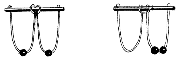 This consisted of a wooden rod with a hole and string knotted through it to form two loops. There were two balls threaded onto the string. They could both be on one loop or each ball could be on its own loop. The challenge was to move a ball from one loop to the other.