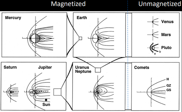 Unlike the Earth, Mars has no inner dynamo to create a major global magnetic field. This, however, does not mean that Mars does not have a magnetosphere; simply that it is less extensive than that of the Earth.