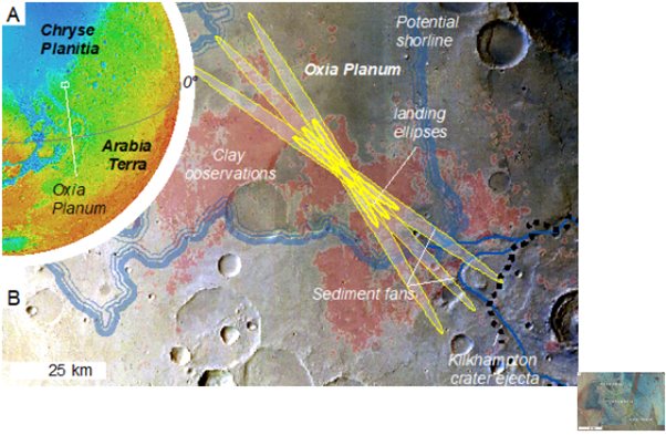 A) Locations of OP on (A) Mars and (B) in Arabia Terra. Phyllosilicate detections are in red. Estimated/study landing ellipses are in yellow. -3000 m contour is shown in blue. Fluvial channels and sediment fan remnants are evident. C) Designation of mapping ‘Areas’.