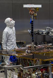 Mars Global Surveyor (MGS) was an American robotic spacecraft developed by NASA’s Jet Propulsion Laboratory and launched November 1996. Mars Global Surveyor was a global mapping mission that examined the entire planet, from the ionosphere down through the atmosphere to the surface. As part of the larger Mars Exploration Program, Mars Global Surveyor performed monitoring relay for sister orbiters during aerobraking, and it helped Mars rovers and lander missions by identifying potential landing sites and relaying surface telemetry.