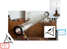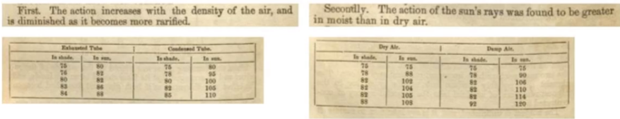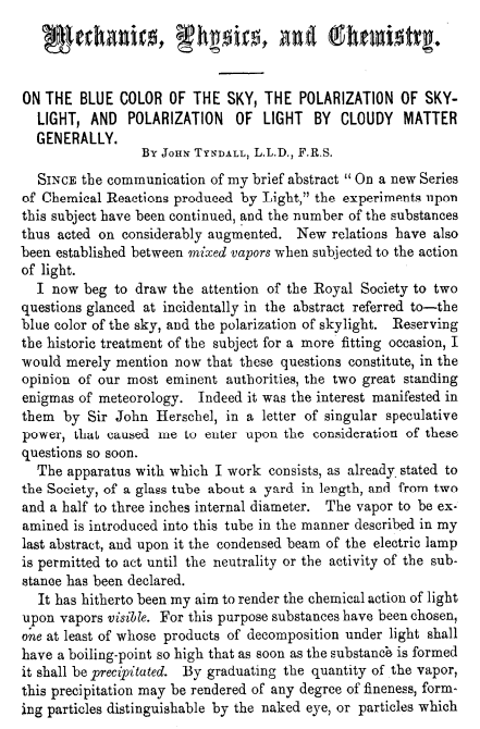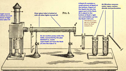 John Tyndall’s illustration of his setup for looking at aerosols (1868), subsequently annotated in coloured typeface. The above apparatus is meant to be looked at in a dark room, i.e., a room with no light except for the illuminated glass tube at the centre of the picture. Its basic idea is to bring a chemical vapour into the illuminated glass tube by a suction pump (the suction pump is under the table). The illustration dates from 1868. With this apparatus John Tyndall found that a variety of vapours, initially clear and transparent to light, became cloudy with more exposure to the light due to chemical decomposition of the vapor molecules. He verified that it was the light itself that caused this decomposition. The chemical reaction in response to the light was in some cases rapid (e.g. when the vapor was amyl nitrite) and in other cases very gradual (e.g. when the vapor was isopropyl iodide). Some vapours formed white clouds, others formed blue or purple clouds. The clouds took on distinctive shapes and swirled in “paroxysms of motion”, in some cases. Tyndall demonstrated that the particular wavelengths that produced a photochemical decomposition depended on the particular type of vapor molecule that was decomposed, although in all cases the light was predominantly or exclusively in the blue and near UV area. Tyndall uses these photochemical reactions as context for talking about the question of the mechanism by which molecules absorb radiant energy. The illustration is in Tyndall’s report “New Chemical Reactions Produced by Light” (1868) and again in Tyndall’s “On the Action of Rays of High Refrangibility upon Gaseous Matter” (1870). It is also included in the later editions of his book Heat as a Mode of Motion even though it is not a heat phenomenon.