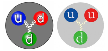 The quark structure of the neutron (left) and proton (right). The colour assignment of individual quarks is arbitrary, but all three colours must be present. Forces between quarks are mediated by gluons.