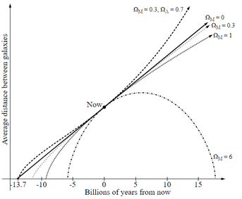 The ultimate fate of an expanding universe depends on the matter density (WM) and the dark energy density (WA)