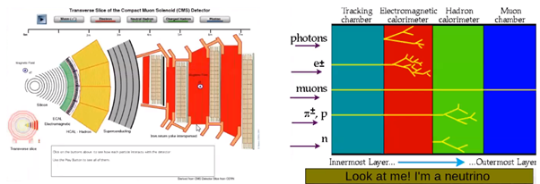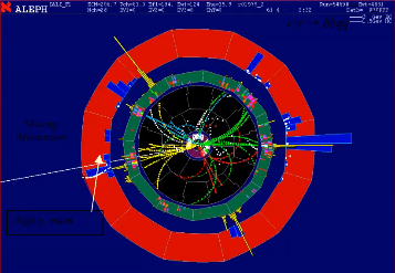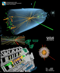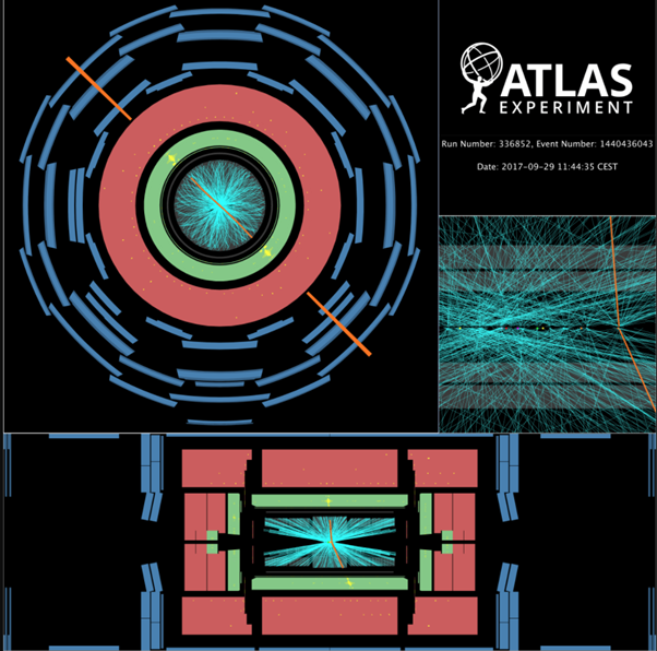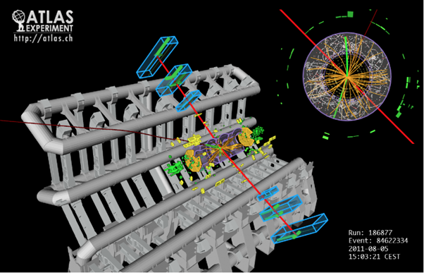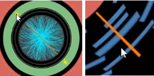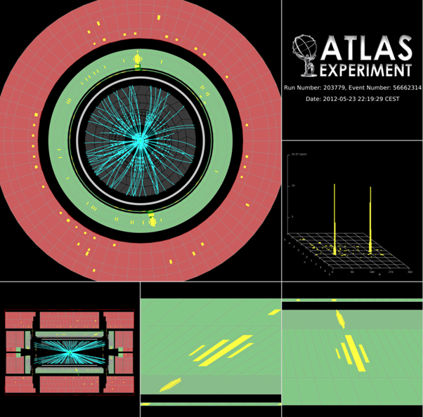 Candidate Higgs boson events from collisions between protons in the LHC. The top event in the CMS experiment shows a decay into two photons (dashed yellow lines and green towers). The lower event in the ATLAS experiment shows a decay into four muons (red tracks)