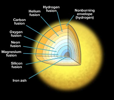 Artist’s illustration of the core of a massive star just prior to a type II supernova explosion. The core is a series of nested spherical shells, with each shell fusing a different element from hydrogen to helium, to carbon, through the periodic table to iron. Credit: Penn State Astronomy & Astrophysics