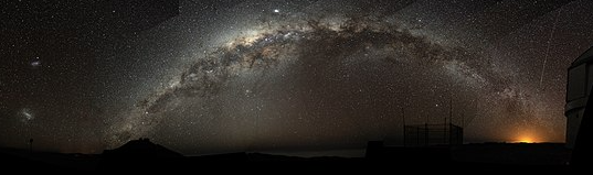 The Milky Way arching at a high inclination across the night sky, (this composited panorama was taken at Paranal Observatory in northern Chile), the bright object is Jupiter in the constellation Sagittarius, and the Magellanic Clouds can be seen on the left; galactic north is downward