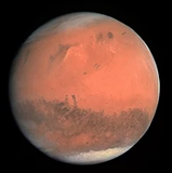 Mars is the fourth planet from the Sun and the second-smallest planet in the Solar System, being larger than only Mercury. In English, Mars carries the name of the Roman god of war and is often referred to as the “Red Planet”. The latter refers to the effect of the iron oxide prevalent on Mars’s surface, which gives it a reddish appearance distinctive among the astronomical bodies visible to the naked eye. Mars is a terrestrial planet with a thin atmosphere, with surface features reminiscent of the impact craters of the Moon and the valleys, deserts and polar ice caps of Earth.