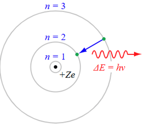 The Bohr model of the hydrogen atom (Z = 1) or a hydrogen-like ion (Z > 1), where the negatively charged electron confined to an atomic shell encircles a small, positively charged atomic nucleus and where an electron jumps between orbits, is accompanied by an emitted or absorbed amount of electromagnetic energy (hν). The orbits in which the electron may travel are shown as grey circles; their radius increases as n2, where n is the principal quantum number. The 3 → 2 transition depicted here produces the first line of the Balmer series, and for hydrogen (Z = 1), it results in a photon of wavelength 656 nm (red light). Z is the number of protons in the nucleus, and n represents the orbit that an electron is allowed. The +e indicated a positive charge.